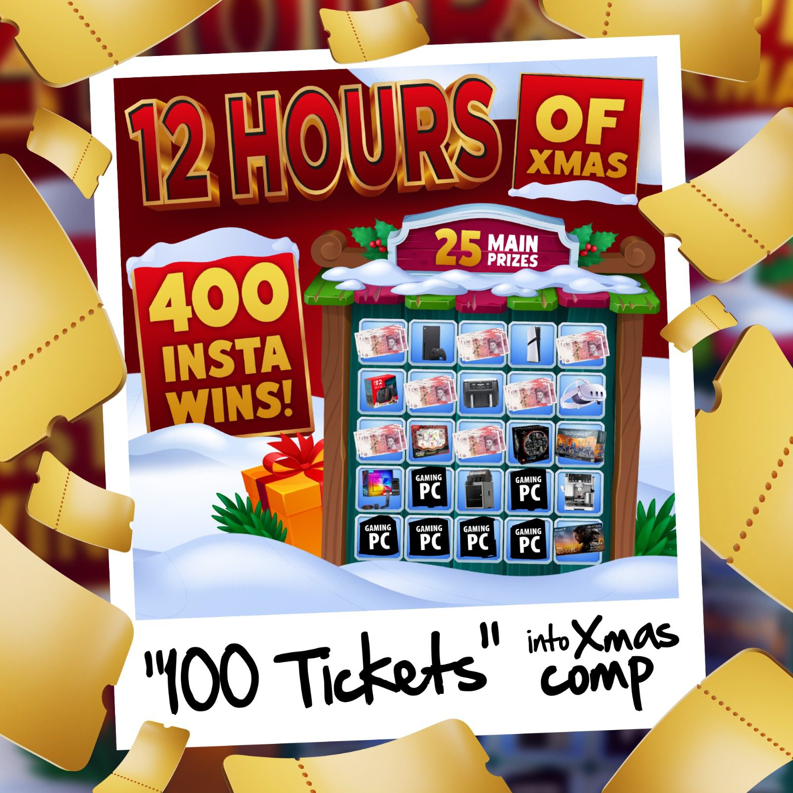 Enter now for your chance to win 100 entries into the 12 Hours of Christmas competition! giving you 100 chances at 25 main prizes and 400 instant wins, including gaming PCs, cash, consoles, tech and more.